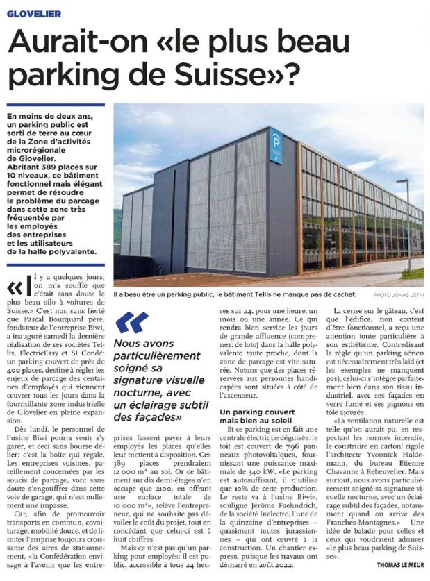 Au-delà de l’aspect fonctionnel, notre savoir-faire architectural a permis de créer un bâtiment qui se distingue clairement des silos à voitures traditionnels. Son design soigné et contemporain a d’ailleurs été salué par le journal Quotidien Jurassien, qui en a souligné l’esthétisme et la singularité.